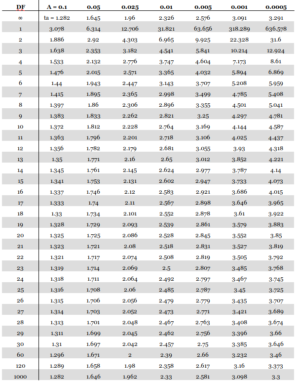One-Tail T-Distribution Table Printable